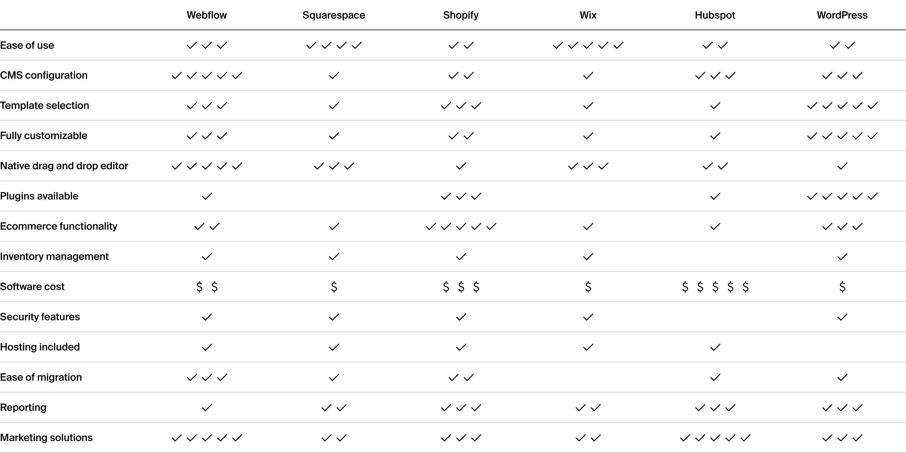 Even though Wordpress is a popular option for corporate websites, the softwareâs DNA as a blogging platform is still visible in the control panel. Itâs too cumbersome to be effective for professional users who may opt for Webflow instead. And itâs not simple enough for less sophisticated users who may opt for Squarespace or Wix.