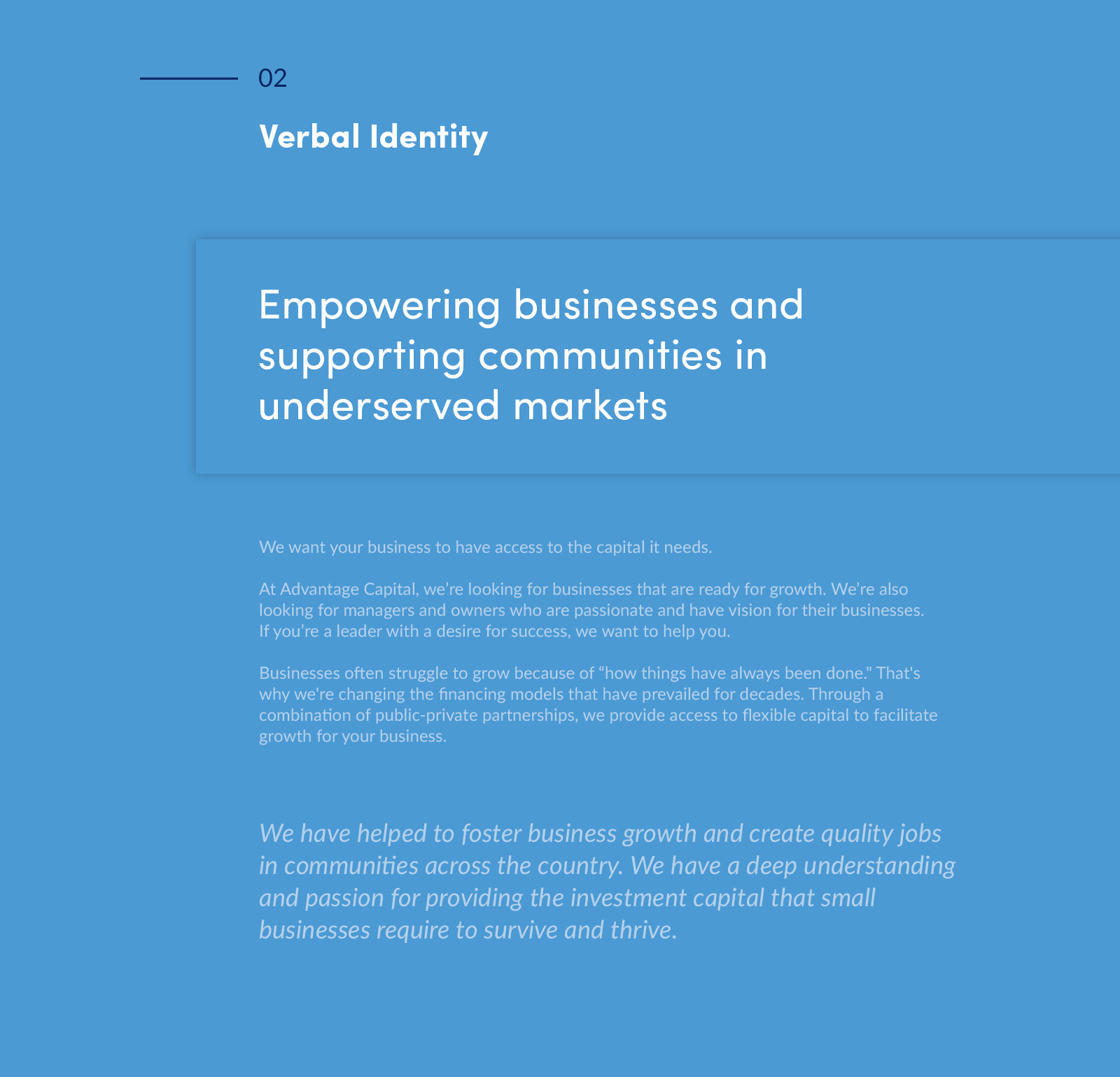 We crafted precise audience profiles revealing specific fears about equity loss and predatory intentions. The refined positioning statement "Empowering businesses and supporting communities in underserved markets" captured genuine purpose. Voice guidelines shifted from financial jargon to clear, direct, accessible language that resonated with Main Street businesses. Visual evolution introduced friendlier blues alongside existing navy and gold, while modern typefaces improved legibility without abandoning established identity.