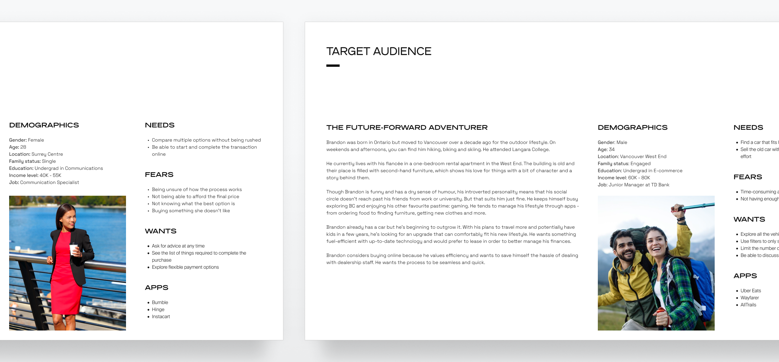 To tackle this, we embarked on a journey of customer discovery and user testing, aiming to tailor an experience that feels personal and intuitive. The team deployed a multifaceted research strategy, seeking to understand the psyche, preferences, and pain points of their prime prospects. By developing rich descriptions of target personas, we were not merely designing for an audience but for individuals with distinct needs, behaviors, and aspirations.This groundwork was crucial in identifying what mattered most to potential customers and how they interacted with online platforms. Through surveys, interviews, and interactive testing sessions, we gathered the insights needed to craft an online experience that could guide users through the car buying process with ease and confidence.