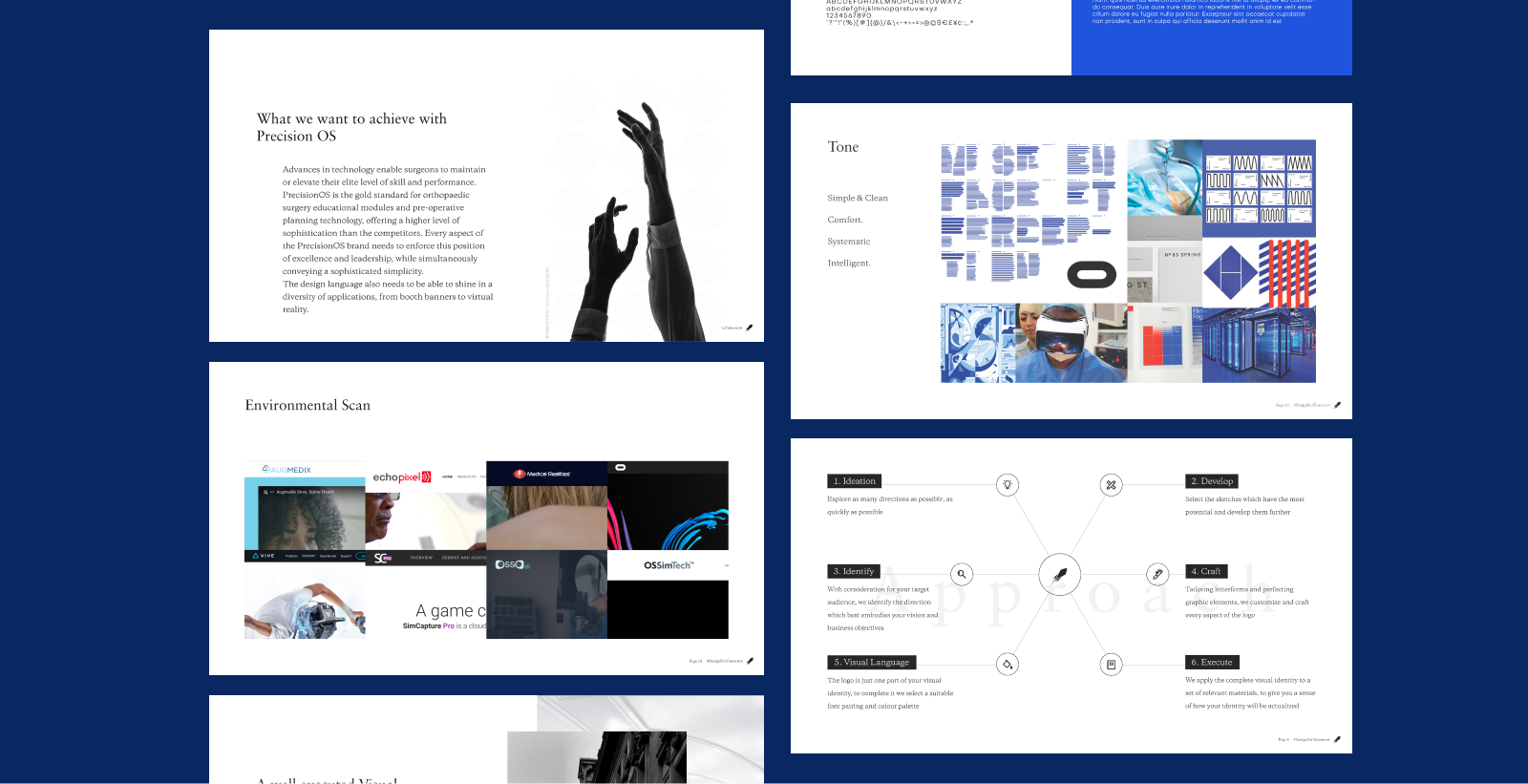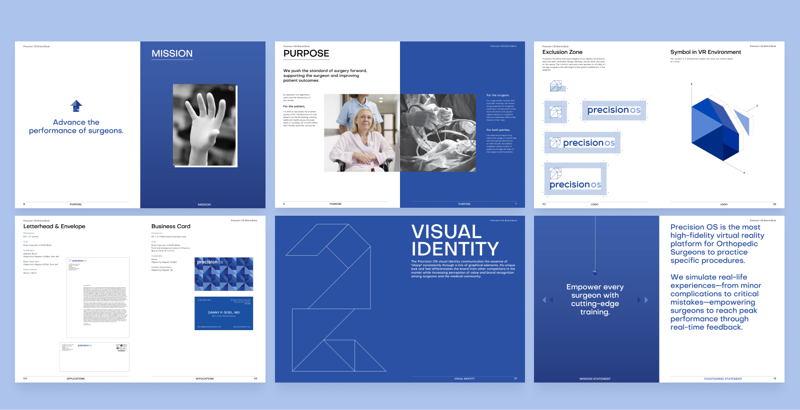 We began with a discovery phase, interviewing stakeholders, surgeons, and medical training partners to understand their vision and positioning challenges. Our research uncovered a critical insight: the team needed to focus on the transformative impact of advanced medical education on patient outcomes, rather than simply promoting their VR technology. PrecisionOS wasn’t just another VR company; they were shaping the future of surgical education.After extensive workshops and discussions with the founders, we developed a new brand essence that communicated their intelligence, precision, and immersive approach to surgical training.