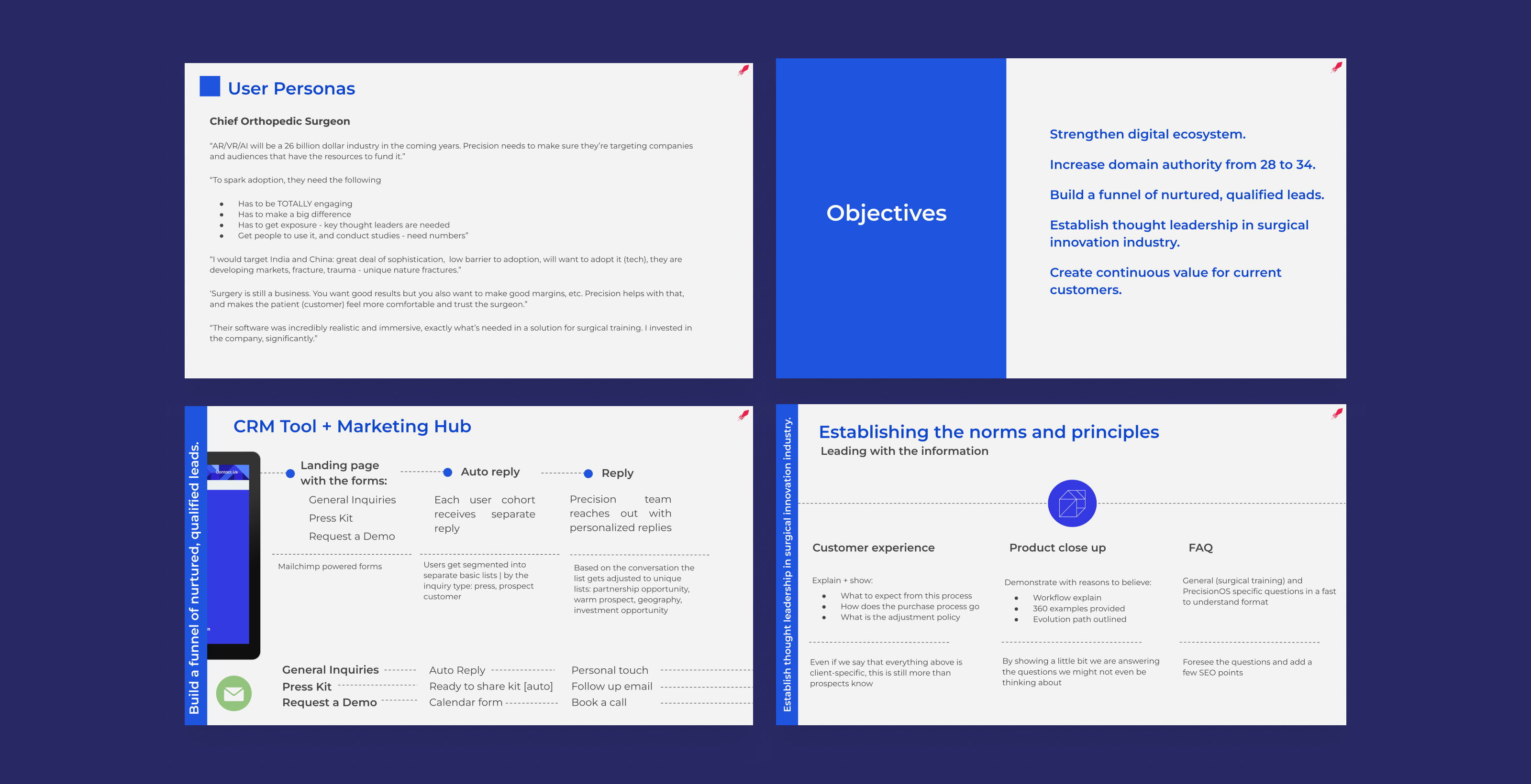 We began by refreshing PrecisionOSās digital channels and developing a comprehensive content strategy focused on long-form, high-value content tailored to the needs of orthopedic surgeons. Through interviews with surgeons and a thorough review of relevant medical journals and publications, we identified key topics that would resonate with the medical audience. The content strategy centered on producing research-based insights into how educational methods, like immersive VR simulations, were improving surgical outcomes.