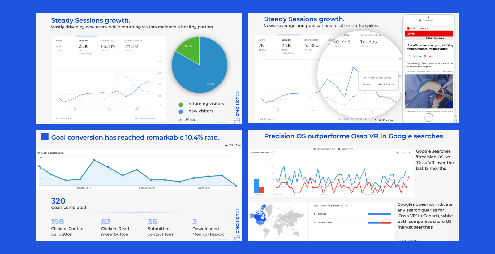 The content strategy led to a 400% sustained increase in organic traffic, driven by exponential improvements in SEO rankings. PrecisionOSās thought leadership presence grew significantly within the medical community, drawing attention to their innovative approach to surgical training.